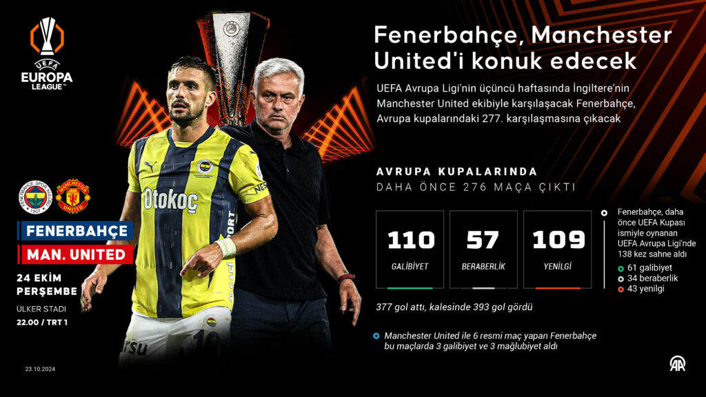Avrupa'da üç Türk kulübü galibiyet arayacak. Fenerbahçe, UEFA Avrupa Ligi’nin üçüncü haftasında bugün İngiliz ekibi Manchester United’ı konuk edecek.vÜlker Stadı’nda saat 22.00’de başlayacak karşılaşmayı Fransa Futbol Federasyonundan Clement Turpin yönetecek. Turpin’in yardımcılıklarını Nicolas Danos ve Benjamin Pages yapacak. Jeremy Stinat ise dördüncü hakem olarak görev alacak. UEFA Avrupa Ligi’ne 2-1’lik Union Saint-Gilloise galibiyetiyle başlayan Jose Mourinho’nun öğrencileri, ikinci maçında Twente deplasmanından 1-1’lik beraberlikle döndü. Sarı-lacivertli ekip 4 puanla 13. sırada yer alıyor. Sahasında Twente ile 1-1, deplasmanda da Porto’yla 3-3 berabere kalan Manchester United, 2 puanla 21. sırada.