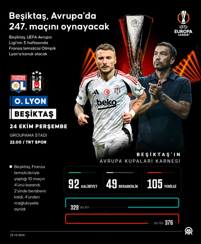 Beşiktaş, UEFA Avrupa Ligi’nin 3. haftasında bugün Fransa temsilcisi Olimpik Lyon’a konuk olacak. Groupama Stadı’nda oynanacak müsabaka, TSİ 22.00’de başlayacak. Karşılaşmayı Alman hakem Harm Osmers yönetecek. Siyah-beyazlı futbol takımı, Avrupa Ligi’nin ilk 2 haftasında yaptığı maçlarda sahadan puansız ayrıldı. Ajax’a deplasmanda 4-0 yenilen Beşiktaş, konuk ettiği Eintracht Frankfurt’a da 3-1 mağlup oldu. Olimpik Lyon ise organizasyonda çıktığı 2 mücadelede hanesine 6 puan yazdırmayı başardı. Fransa ekibi, Olympiakos’u 2-0, Rangers’ı da 4-1 mağlup etti.