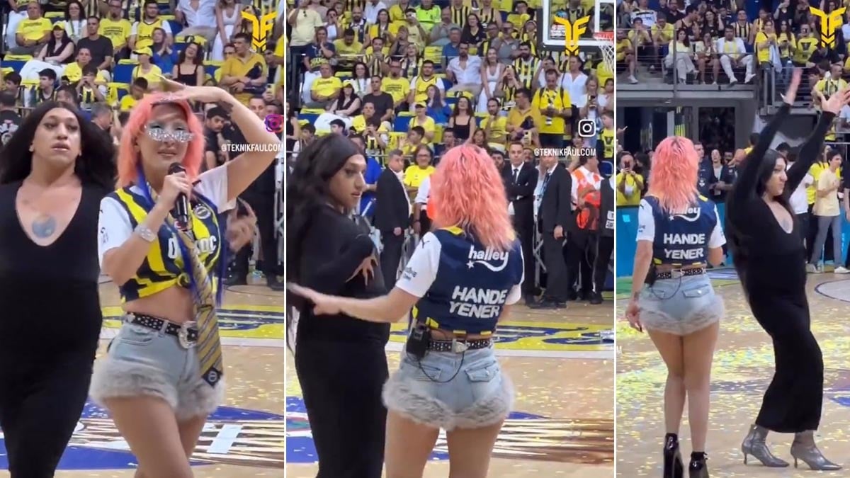 Ülker Spor ve Etkinlik Salonu’nda şampiyonluğu kutlayan Sarı Lacivertliler, Hande Yener’in şarkılarıyla eğlendi. Ünlü şarkıcı Yener, siyah elbiseli ve uzun siyah saçlı bir dansçıyla birlikte salona çıktı.