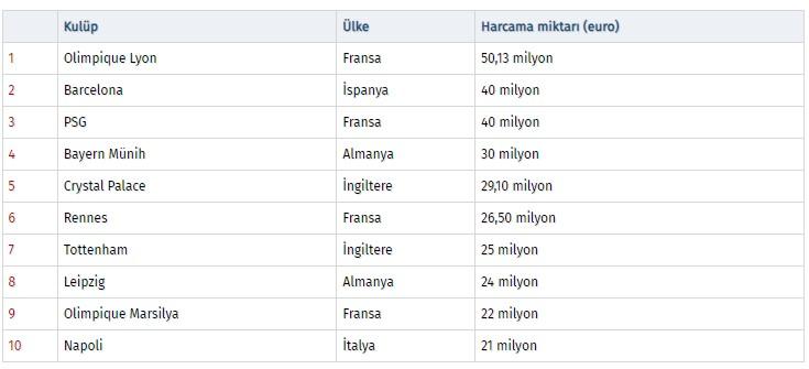 Ara transfer döneminde en fazla para harcayan kulüp, Ligue 1’de zor günler geçiren Olimpique Lyon oldu. Ligde yalnızca dört galibiyet alabilen ve 16. sırada bulunan teknik direktör Pierre Sage yönetimindeki Lyon, transfer ettiği veya kiraladığı sekiz oyuncu için 50,13 milyon euro harcadı. Ocak ayında en fazla para harcayan 10 kulüp arasında Ligue 1’den dört takım yer alırken, Lyon’u 40’ar milyon euro harcamayla Barcelona ve Paris Saint Germain takip etti. Almanya’da ara transfere en çok bütçe ayıran takım Bayern Münih, İngiltere’de Crystal Palace, İtalya’da ise Napoli oldu.