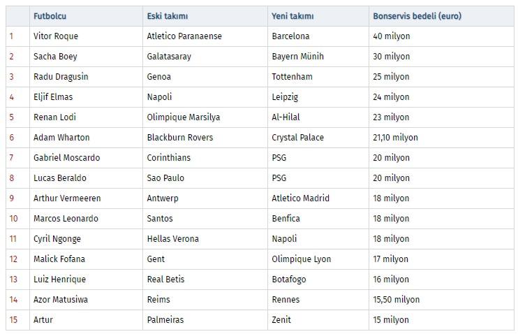 Kış döneminin en flaş transferine Atletico Paranaense’nin Brezilyalı forveti Vitor Roque’yi renklerine bağlayan Barcelona imza attı. Katalan ekibi, 18 yaşındaki oyuncu için 40 milyon euro bonservis bedeli ödedi. Ara transferin en pahalı oyuncuları arasında tanıdık isimler de yer alırken, listenin ikinci sırası 30 milyon euro bedelle Galatasaray’dan Bayern Münih’e giden Sacha Boey’in oldu. Bir dönem Fenerbahçe forması giyen Eljif Elmas da 24 milyon euro’ya Napoli’den Leipzig’e transfer olarak dikkati çekti.