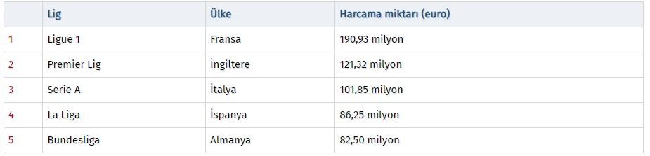 2022-2023 ara transfer döneminde 842,56 milyon euro harcayarak rekor kıran Premier Lig ekiplerinin kasasından bu sezon yalnızca 121,32 milyon euro çıktı. Ligue 1, 190,93 milyon euro’luk bedelle Avrupa’da en çok harcama yapılan lig oldu. Listenin üçüncü sırasında ise 101,85 milyon euro ile Serie A yer aldı.