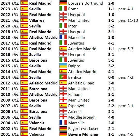 Şu bir gerçek ki İspanyol takımları bilhassa 21. yüzyıldaki finalleri domine ettiler. Bazen kendilerine karşı olmak üzere çoğunlukla diğer ülke rakiplerini geçtiler. İspanyollar bu süreçte Dokuz İngiliz, Dört İtalyan, İki Alman, İki Fransız, bir Ukrayna, bir Portekiz takımını bozguna uğrattılar ve turnuvaların değişilmez şampiyonu olduklarını kanıtladılar.