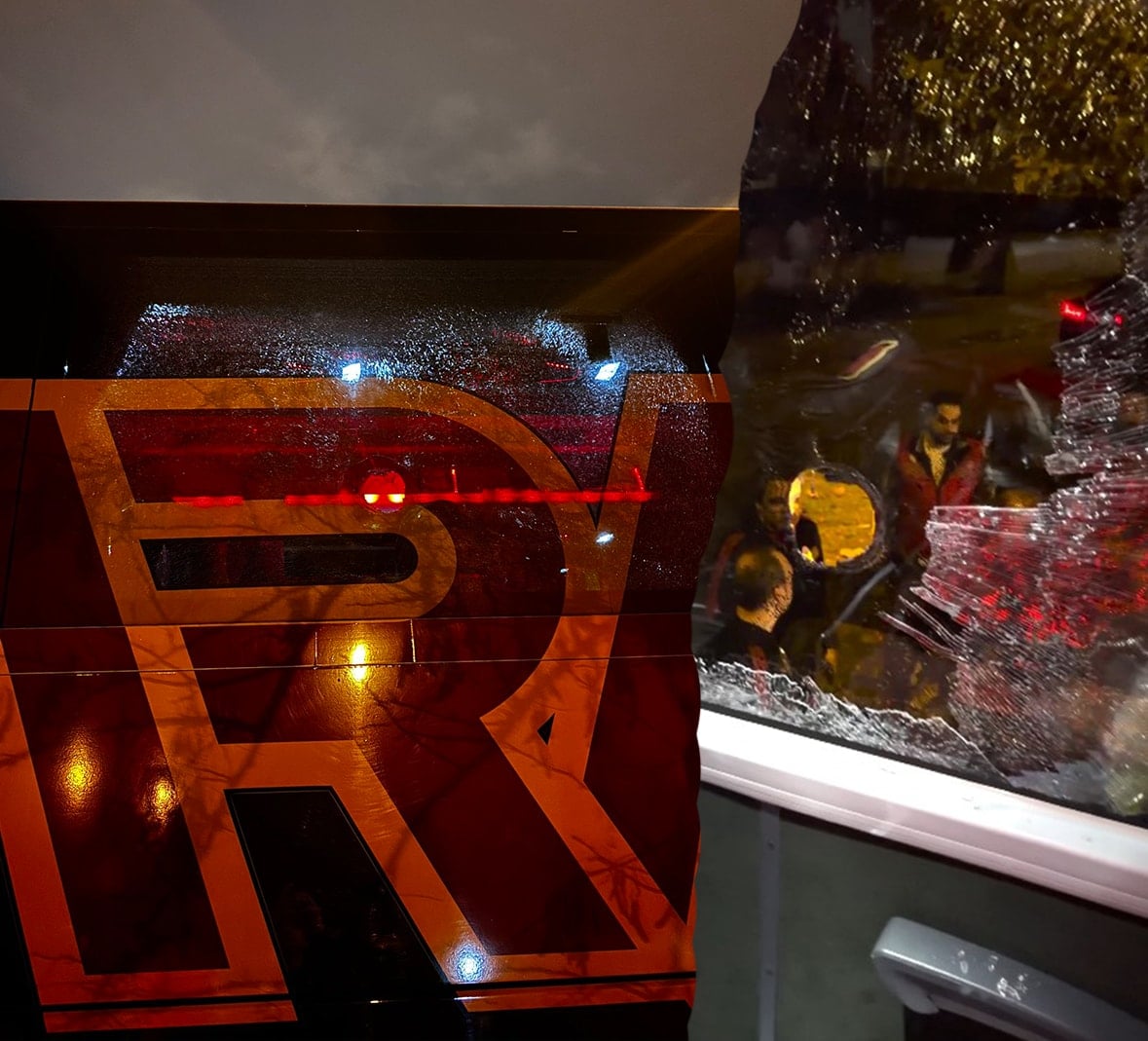 Sarı-kırmızılılardan yapılan açıklamaya göre kafileye dönüş yolunda bir grup tarafından taşlı saldırıya uğradı. Emniyet güçleri, otobüsün camının kırıldığı olayın şüpheli ya da şüphelilerinin yakalanması için çalışma başlattı.