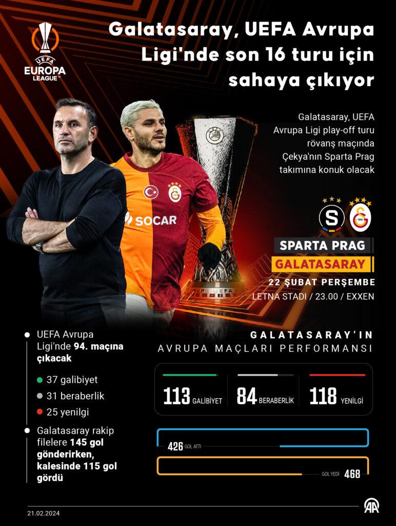 Okan Buruk önderliğinde Galatasaray, Sparta Prag karşısında son 16 bileti arayacak. UEFA Avrupa Ligi play-off turu rövanş maçında Galatasaray, Çekya’nın Sparta Prag ekibine karşı deplasmanda son 16 bileti arayacak. İngiliz hakem Anthony Taylor’ın yöneteceği maçta sarı-kırmızılılara tur atlamak için beraberlik dahi yeterli olacak.