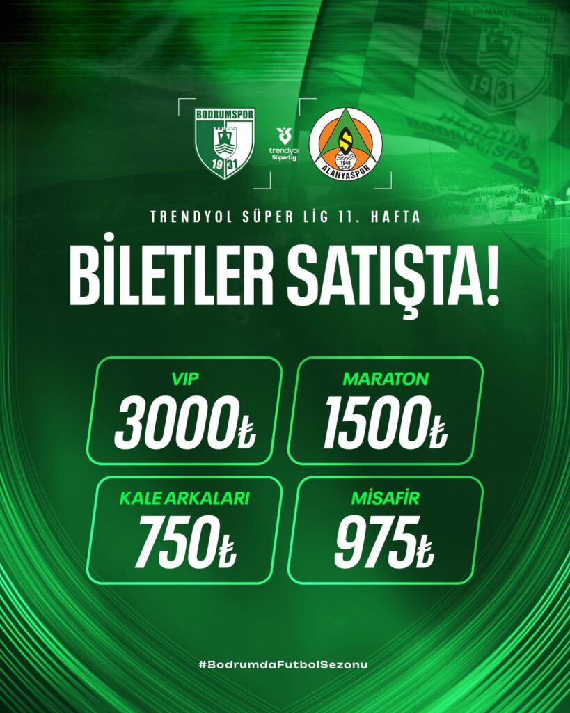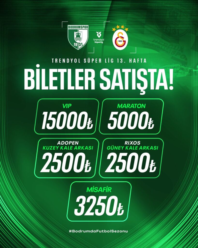 Bodrum ekibinin yaptığı paylaşımla duyurduğu fiyatların çok yüksek olması dikkat çekti. Süper Lig’in yenilgisiz liderini konuk edecek takım en ucuz biletler olan kale arkası biletlerini 2 bin 500 lira olarak belirledi. Maraton biletlerinin fiyatı 5 bin olarak belirlenirken VIP biletlerin fiyatıysa 15 bin lira oldu. Maça gelmek isteyen Galatasaray taraftarlarının ödemeleri gereken fiyat ise 3 bin 250 TL.