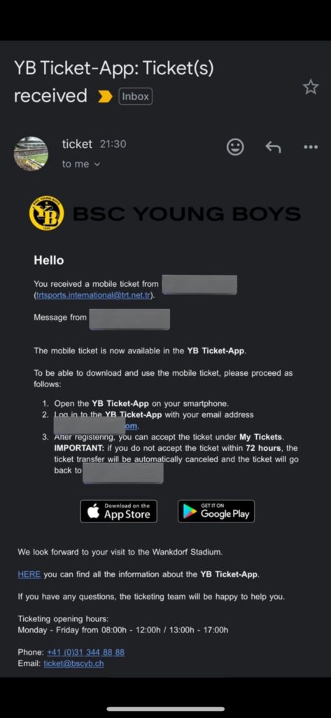 Bu kişi Almanya merkezli bir karaborsa bilet sitesinden VIP kategori bilet buldu. Normalde 70 frank’a satılması gereken biletler için her birine 325 euro ödeyerek iki bilet satın aldı. Karaborsadan alınan biletin sahibinin kişisel bilgileri site tarafından paylaşıldı. Bileti B.D. isimli bir kadından almasına rağmen biletler E.B.K. isimli bir şahıstan ve kurumsal bir e-posta adresi olan [email protected] üstünden transfer edildi. Maç günü yanındaki kişilerin de aynı şekilde karaborsa bilet aldığını öğrendi. Biletlerin alındığı tribünde Galatasaray yöneticileri, Okan ve Yiğit Buruk, Ayhan Akman gibi isimler de vardı. Paylaşımda “Burada adı geçen tüm kişilerin isimleri, bilet ve koltuk numaraları, banka dekontları, biletin transfer edildiği adresi gösteren e-posta ve telefon görüşmeleri, Young Boys kulübü ve Credit Suisse ile yapılan telefon görüşmelerinin kayıtları ve hatta maç günü tribünde Galatasaray yöneticileri ile çekilmiş fotoğraflar, talep edilirse yasal mercilerle paylaşılacaktır” dendi.
