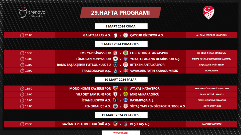 Süper Lig’de 29’uncu haftanın yenilenen maç programı.