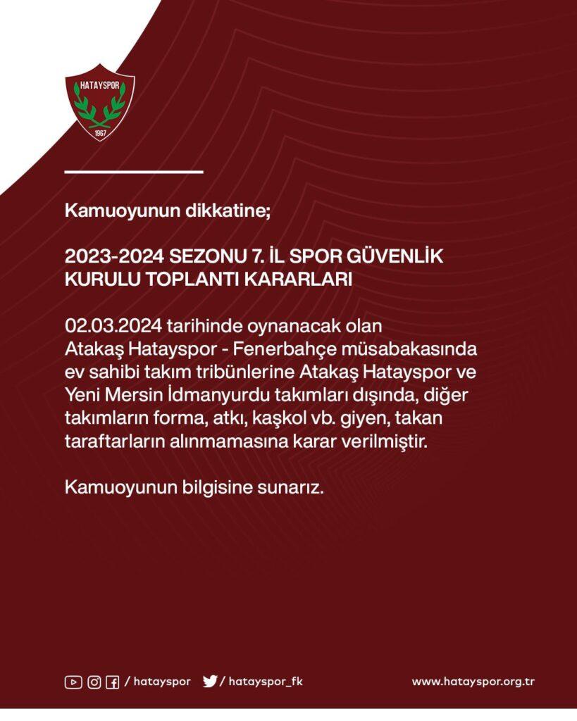 “2 Mart 2024 tarihinde oynanacak olan Hatayspor – Fenerbahçe müsabakasında ev sahibi takım tribünlerine Hatayspor ve Yeni Mersin İdmanyurdu takımları dışında diğer takımların forma, atkı, kaşkol vb. giyen, takan taraftarların alınmamasına karar verilmiştir.”