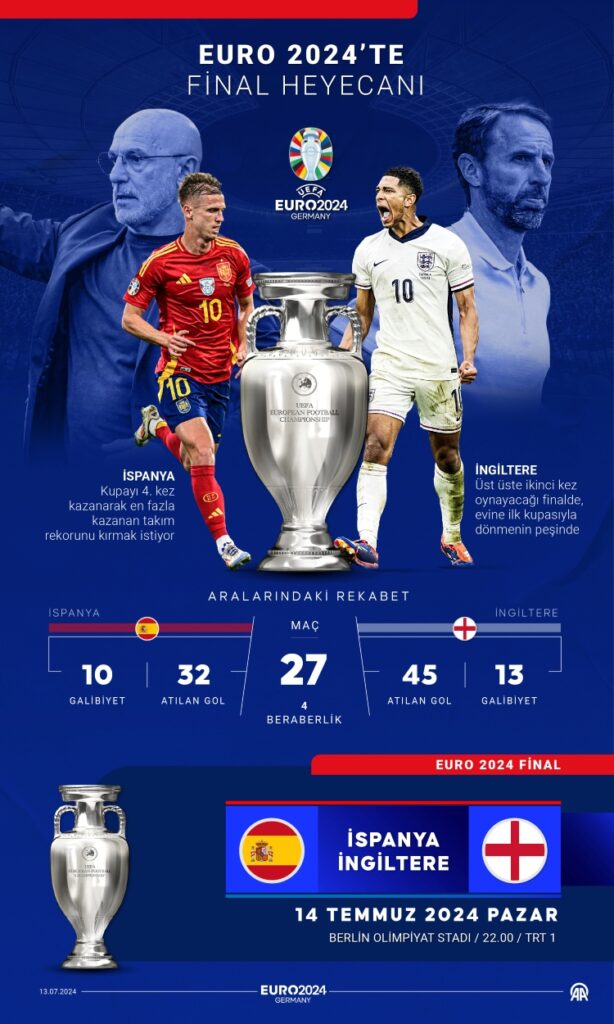 Harry Kane ve Lamine Yanal takımlarının en büyük kozları olacak. Avrupa Futbol Şampiyonası, İspanya ile İngiltere finaliyle sona eriyor. Almanya’nın başkenti Berlin’deki Olimpiyat Stadı’nda saat 22.00’de başlayacak final maçı, TRT 1’den naklen yayımlanacak. Karşılaşmayı Fransa Futbol Federasyonundan hakem François Letexier yönetecek. Letexier’in yardımcılıklarını aynı ülkeden Cyril Mugnier ve Mehdi Rahmouni yapacak.