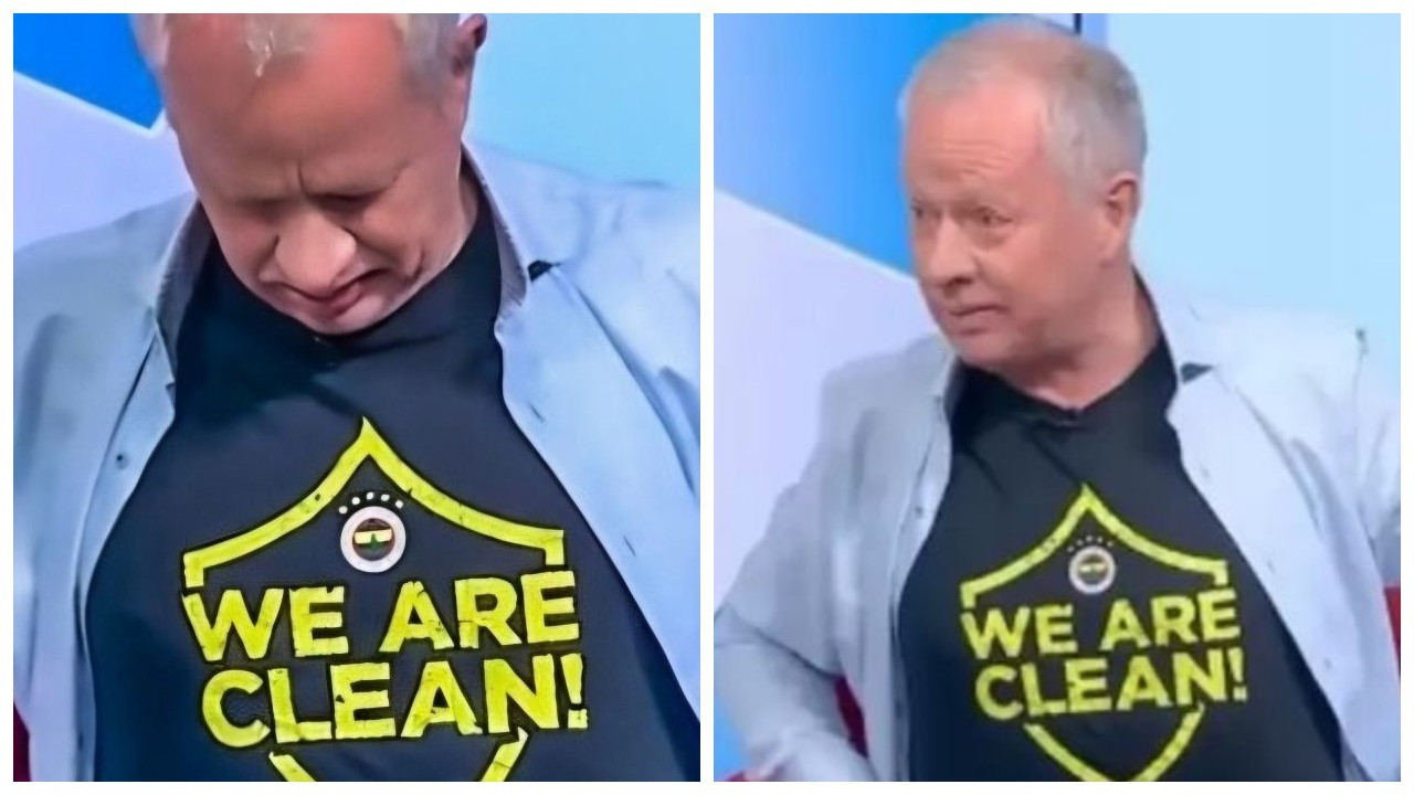 İngiliz gazeteci Gary Cotterill, dünyanın önde gelen TV kanallarından Sky Sports’un canlı yayınına, Fenerbahçe’nin geçtiğimiz günlerde satışa sunduğu ve üzerinde ‘We are Clean’ (Biz temiziz) yazan tişörtle çıktı.