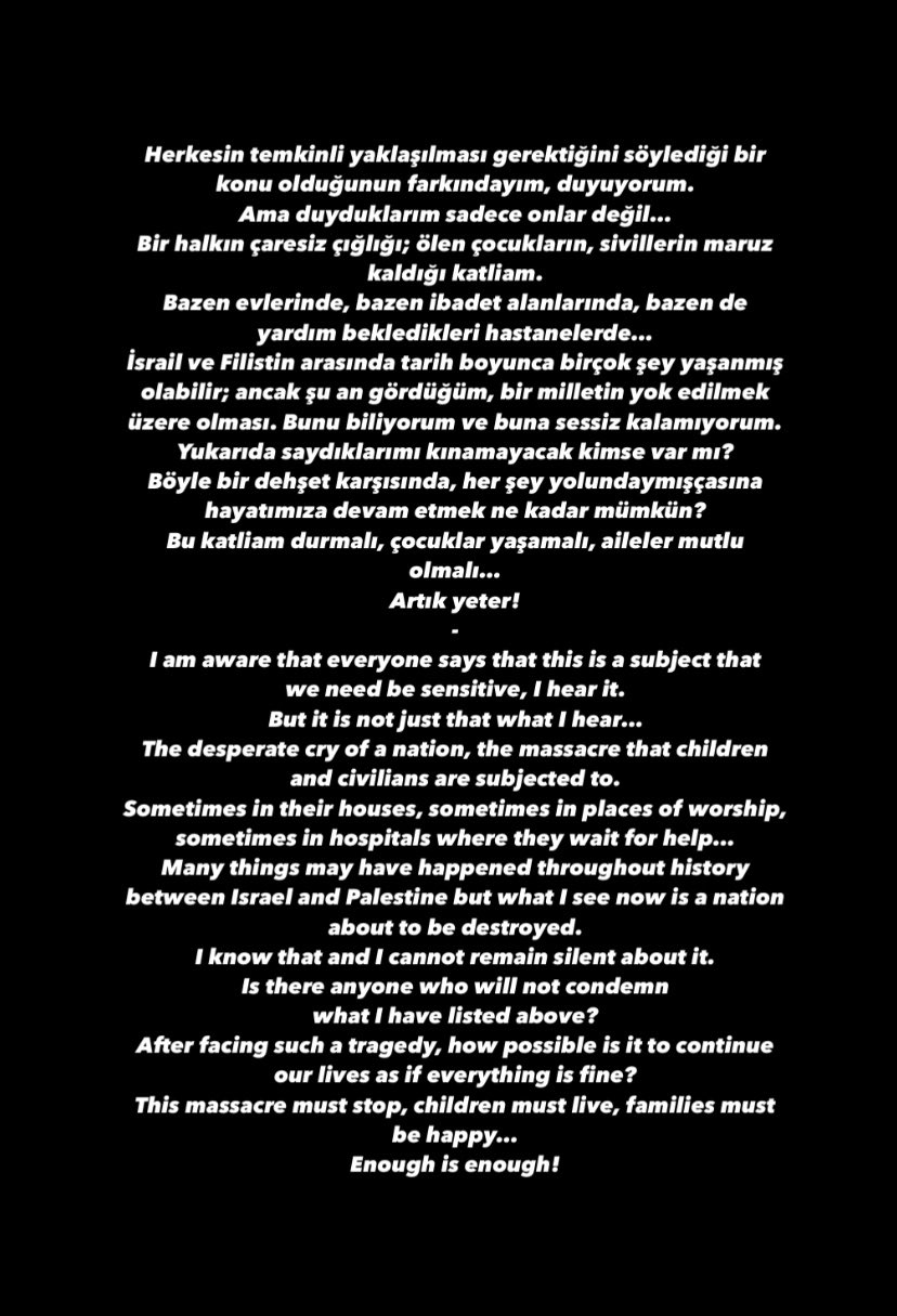 “Herkesin temkinli yaklaşılması gerektiğini söylediği bir konu olduğunun farkındayım, duyuyorum. Ama duyduklarım sadece onlar değil. Bir halkın çaresiz çığlığı; ölen çocukların, sivillerin maruz kaldığı katliam. Bazen evlerinde, bazen ibadet alanlarında, bazen de yardım bekledikleri hastanelerde. İsrail ile Filistin arasında tarih boyunca birçok şey yaşanmış olabilir ancak şu an gördüğüm, bir milletin yok edilmek üzere olması. Bunu biliyorum ve buna sessiz kalamıyorum. Yukarıda saydıklarımı kınamayacak kimse var mı? Böyle bir dehşet karşısında her şey yolundaymışçasına hayatımıza devam etmek ne kadar mümkün? Bu katliam durmalı, çocuklar yaşamalı, aileler mutlu olmalı. Artık yeter!”
