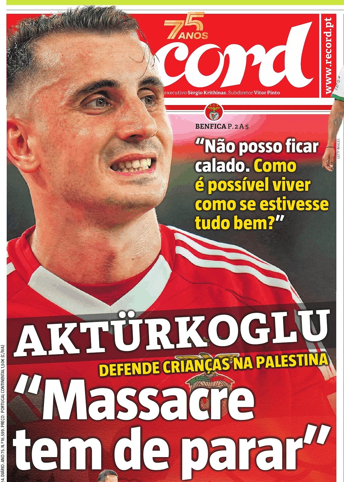 Portekiz spor basınının önemli gazetelerinden Record da Kerem’in bu mesajını manşetten okurlarına taşıdı. Gazetenin ilk sayfasını boydan boya Kerem’e ayıran basın organı milli futbolcunun “Bu katliam durmalı” sözlerini büyük puntolarla yazdı.