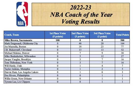 Mike Brown, aynı ödülü daha önce 2008-09 sezonunda Cleveland Cavaliers’ı çalıştırdığı dönemde kazanmıştı. Kings, bu sezonu 48-34 gibi bir dereceyle bitirdi ve tüm ligde 7. en iyi dereceye sahip takım oldu. Kings’in en son ilk 7’de olduğu sezon 2003-04 sezonuydu. Son play-off yolculuğunu 17 sene önce yapan takım Brown’la beraber yeniden aynı yola girdi.
