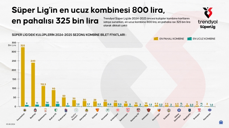 2024-25 sezonunda en pahalı kombine bilet Fenerbahçe'nin en ucuuzu Konyaspor'un oldu. Galatasaray'da kombine sahiplerinin yüzde 97'si biletlerini yeniledi.
