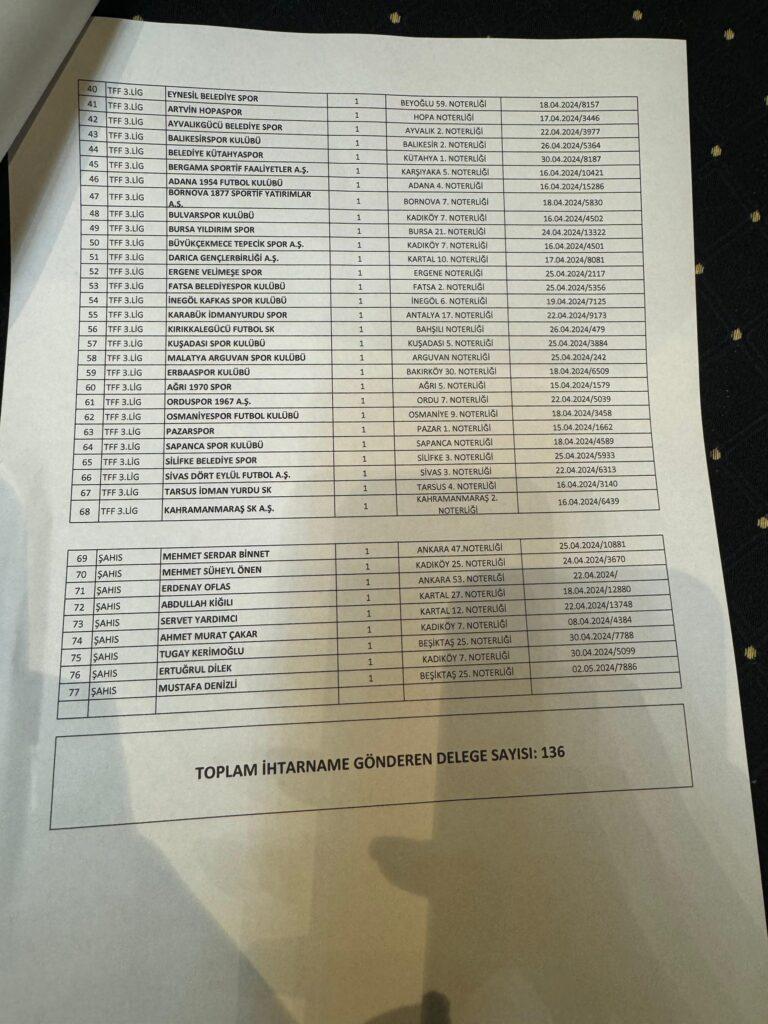 Türkiye Futbol Federasyonu ise bu açıklamaya karşılık “Türkiye Futbol Federasyonu’na olağanüstü kongre çağrısıyla ulaşan imza sayısı bugün itibarıyla 109’dur. İmzalarını noter onayıyla resmen geri çeken delege sayısı 13’tür. Yetkisiz kişilerin geçersiz imza sayısı 2’dir. Sonuç itibarıyla olağanüstü genel kurul yapılması talebiyle TFF’de imzası bulunan delege sayısı 94’tür. Kamuoyunu yanıltmak maksadıyla verilen gerçek dışı beyanlara itibar edilmemesini kamuoyunun bilgisine saygıyla sunarız” yanıtını verdi.