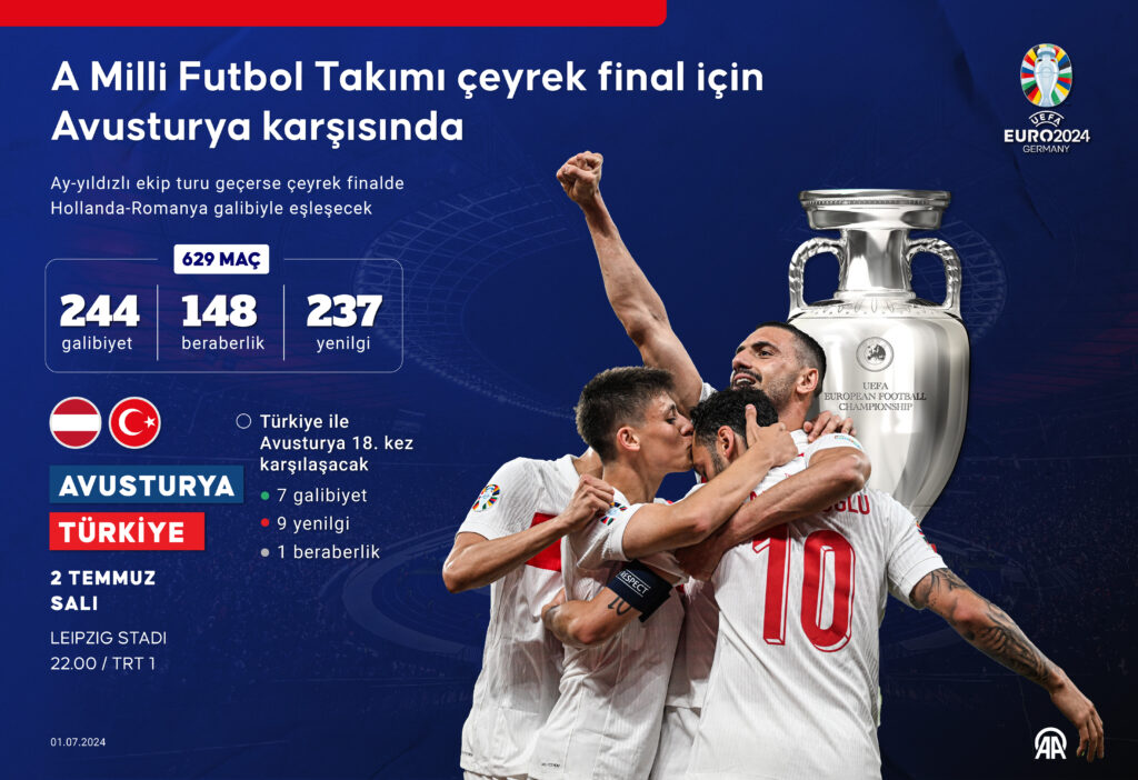 Euro 2024 son 16 turunda Türkiye bir ay önce hazırlık maçında 6-1 yenildiği Avusturya ile karşılaşacak. Karşılaşmayı kazanan çeyrek finalde Romanya- Hollanda maçının galibiyle oynayacak.