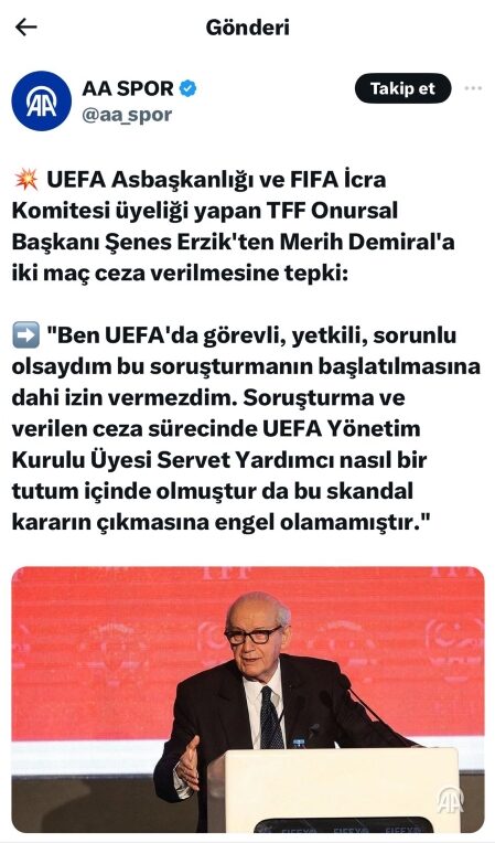 Cezanın açıklanmasından sonra aynı anda tanınmış sosyal medya hesaplarından bir anda Servet Yardımcı aleyhine mesajlar atılmaya başlandı. Derken Anadolu Ajansı’ndan sosyal medya hesabından uzun yıllar FIFA ve UEFA’da üst düzey yöneticilik yapan TFF Onursal Başkanı Şenes Erzik’in sözleri paylaşıldı. Erzik “Ben UEFA’da görevli, yetkili veya sorumlu olsaydım bu soruşturmanın başlatılmasına dahi izin vermezdim. Soruşturma ve verilen ceza sürecinde UEFA Yönetim Kurulu Üyesi Servet Yardımcı nasıl bir tutum içinde olmuştur da bu skandal kararın çıkmasına engel olamamıştır” demişti. Bu mesaj Şenes Erzik’in “Anadolu Ajansı’na böyle bir açıklama yapmadım” demesi üzerine silindi. Peki bu olay nasıl gerçekleşmişti?