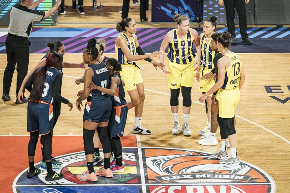 Fenerbahçe maça Meesseman, Milic, Collier’lı uzun beşle başlamanın avantajını kullandı. Hücum ribauntlarıyla üstünlüğü ele aldılar. Mersin zorlama dış şutlarla işini zora soktu. Oysa ilk yarı boyunca Fenerbahçe kaybettiği 9 topla rakibinin hücum ribauntu zaafını nötrlemişti. Öte yandan ABD’li kısa Yvonne Anderson’ın erken üç faul alması da Fenerbahçe’nin fazlasıyla top kaybı yapmasına neden oluyordu. Mersin ekibi ikinci çeyrekte ilk faulünü 1.23 kala yaptı, sertlik düzeyini yukarı çekemediler, ilk yarı 48-42 sarı-lacivertli takımın üstünlüğüyle bitti.