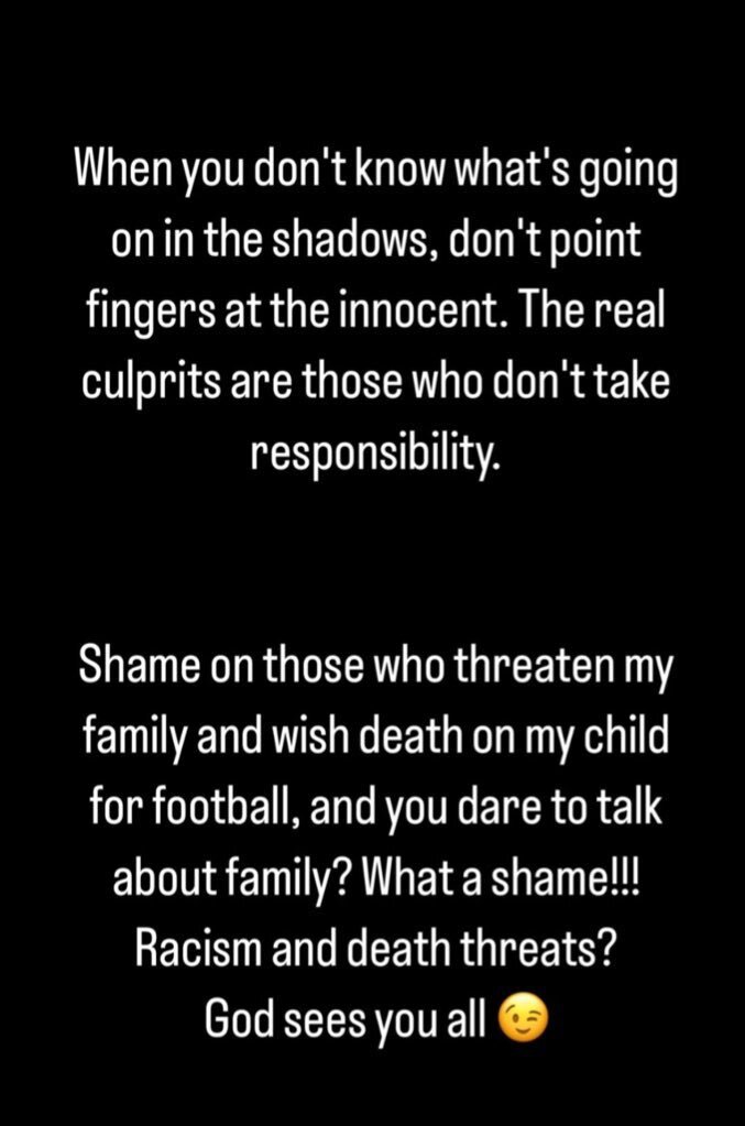 “Arka planda neler olup bittiğini bilmiyorsanız masumları işaret etmeyin. Asıl suçlu sorumluluk almayanlardır. Futbol uğruna ailemi tehdit eden, çocuğumun ölmesini dileyenlere yazıklar olsun, siz aileden söz etmeye nasıl cüret ediyorsunuz? Ne ayıp! Irkçılık ve ölüm tehditleri mi? Allah hepinizi görüyor.” dedi.