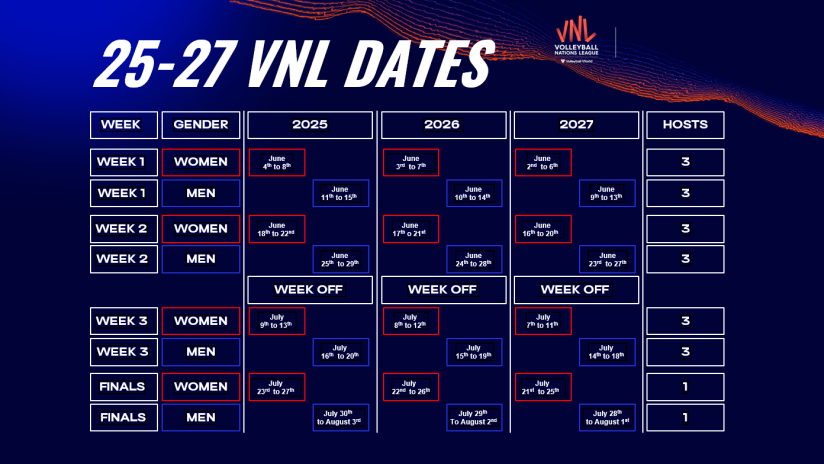 2025 itibariyle çekirdek ve challenger takım kavramı ortadan kalkacak. 18 takım arasında son sırada olan takım direkt olarak küme düşecek ve Milletler Ligi’nde yer almayıp dünya sıralamasında en üst sırada bulunan takım düşen ekibin yerini alacak. Genişleme sonrası ilk aşamada her takım üç haftada toplam 12’şer maç yapmaya devam edecek. Bununla birlikte, her biri altı takımla üç farklı mekanda haftada üç havuz oynanacak. Müsabaka günlerinin sayısı haftada altıdan beşe düşürülecek. Oyuncular ayrıca bir hafta daha dinlenecekler. Erkekler turnuvasında ikinci yarışma haftasından sonraki hafta boyunca her iki cinsiyet için de VNL yarışması yapılmayacak.