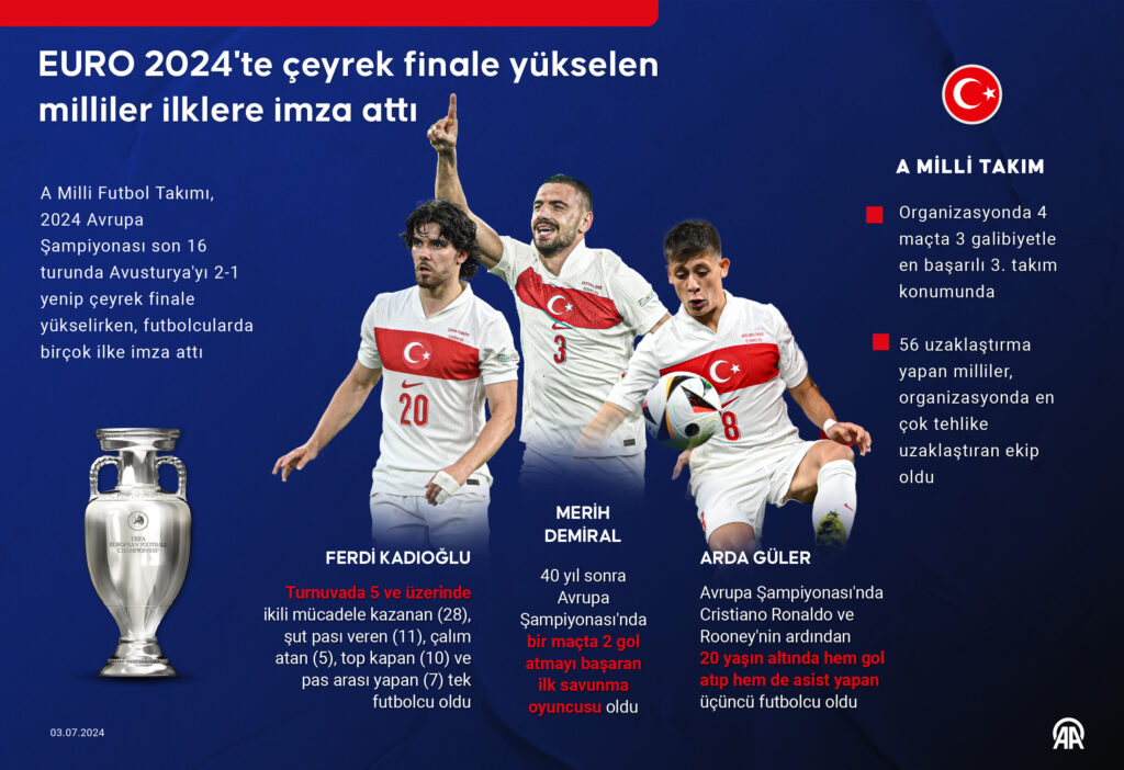 A Milli Futbol Takımı, 2024 Avrupa Şampiyonası son 16 turunda Avusturya’yı 2-1 yenip çeyrek finale yükselirken, futbolcular da birçok ilke imza attı.