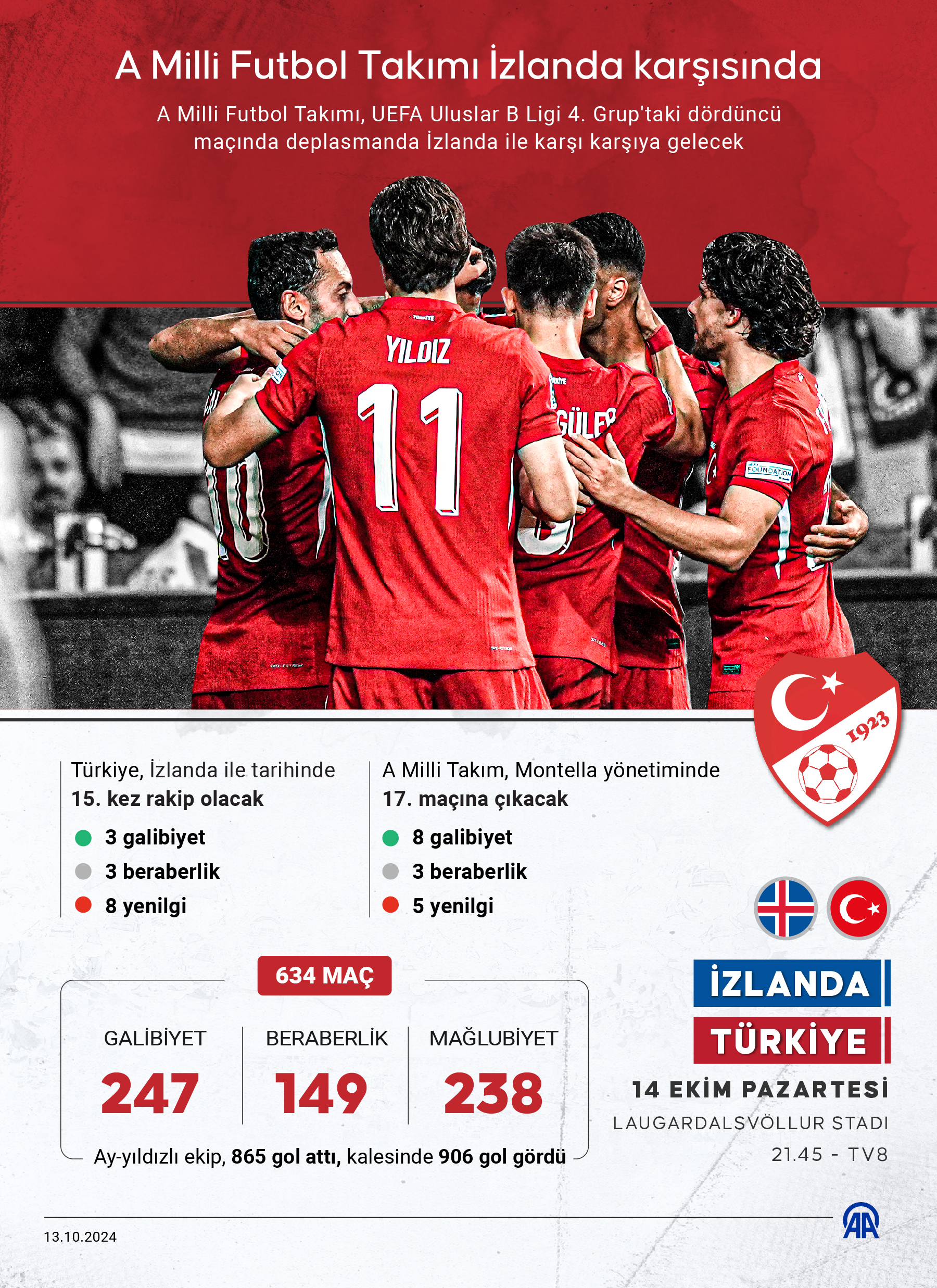 Türkiye, 101 yıllık tarihinde 349’u resmi, 285’i özel toplam 634 maç oynayıp biri hükmen 247 galibiyet, 149 beraberlik ve 238 yenilgi yaşadı. Ay-yıldızlılar, 271’i deplasmanda, 274’ü Türkiye’de, 89’u ise tarafsız sahada çıktığı maçlarda, üç tanesi hükmen galibiyet sonucunda 865 gol attı, kalesinde 906 gol gördü. Türkiye, İzlanda ile 15. randevuya çıkacak. Milliler 13’ü resmi biri özel olmak üzere İzlanda ile yaptıkları 14 maçta sekiz kez sahadan yenilgiyle ayrıldı. üç maç beraberlikle sonuçlanırken, ay-yıldızlı ekip üç karşılaşmada rakibine üstünlük sağladı. Yedisi İzlanda’da, yedisi Türkiye’de oynanan bu maçlarda İzlanda’nın attığı 24 gole, Türkiye 14 golle yanıt verdi. İki takım arasında son olarak 9 Eylül’de İzmir’de oynanan maçı ay-yıldızlı ekip 3-1 kazandı.