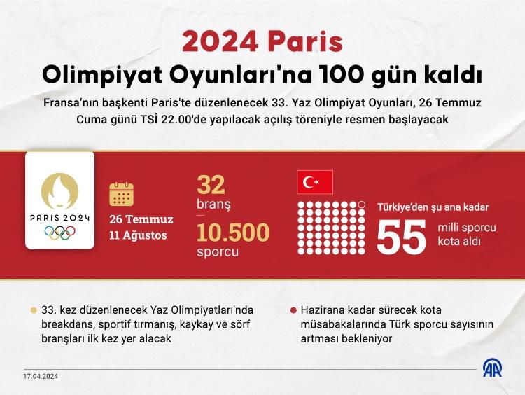 Paris 2024 Olimpiyat Oyunları’nın başlamasına 100 gün kala milli sporcular şu ana kadar atıcılık, atletizm, yol bisikleti, boks, artistik cimnastik, güreş, halter, okçuluk, tekvando, voleybol, yelken ile yüzmede Paris’te madalya mücadelesi verecek. Türkiye Milli Olimpiyat Komitesi’nin sitesinde yer alan ve 15 Nisan’da güncellenen listeye göre Türkiye Paris 2024’e 55 sporcuyla katılmayı garantiledi. Haziran ayına kadar sürecek kota müsabakalarında olimpiyata katılacak Türk sporcu sayısının artması bekleniyor. Tokyo 2020 Olimpiyat Oyunları’nda madalya kazanan 13 isimden milli boksörler Busenaz Sürmeneli ve Buse Naz Çakıroğlu, okçulukta Mete Gazoz, güreşte Taha Akgül, Rıza Kayaalp ve Yasemin Adar Yiğit, artistik cimnastikte Ferhat Arıcan, tekvandoda Hatice Kübra İlgün ve Hakan Reçber, Paris 2024 için Türkiye’ye kota kazandırdı. 2020 Tokyo’da karatede madalya alan dört isim ise bu branşın Paris 2024’te yer almayacağından olimpiyatta mücadele edemeyecek. Tokyo’da 1/8 Türk sporcu olimpiyatlarda yer almıştı.