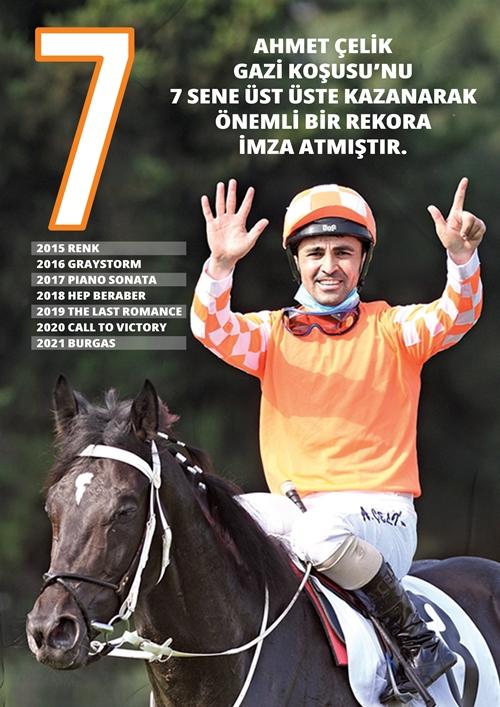 Yedi yarışlık serisi geçen sene sonra eren Ahmet Çelik cezası nedeniyle yarışta yok. Çelik, 9 Nisan’da Adana’da yapılan koşuda jokey İsa Akyavuz’a fiziki müdahale teşebbüsünde bulunması sonucu 120 gün ceza aldı.