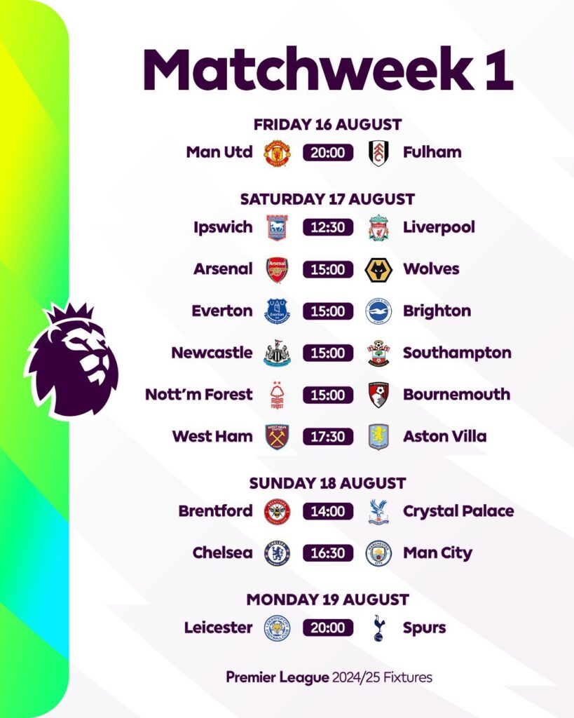 Premier Lig'de yeni sezonun fikstürü açıklandı. İngiltere Premier Lig’de yeni sezonun fikstürü duyuruldu. 16 Ağustos tarihinde başlayacak olan dev mücadelenin ilk haftasının en önemli karşılaşmasında Chelsea son şampiyon Manchester City’yi konuk edecek. Geride kalan sezonu ikinci sırada tamamlayan Arsenal ise sezonu iç sahada oynayacağı Wolverhampton karşılaşmasıyla açacak. 2024-2025 sezonuna teknik direktör Arne Slot yönetiminde girecek olan Liverpool ise ligin yeni takımlarından Ipswich Town’a konuk olacak. Premier Lig’de sezonun ilk hafta fikstürü şu şekilde: