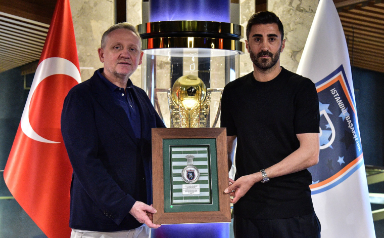 Başakşehir Başkanı Göksel Gümüşdağ, Mahmut Tekdemir’e plaket verdi.
