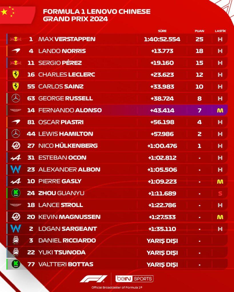 Formula 1'de sezonun beşinci yarışı Çin'de koşuldu. Sprint yarışını kazanan Verstappen, Grand Prix'den de zaferle ayrıldı. Damalı bayrağı ikinci sırada gören isim Lando Norris oldu. Red Bull'un diğer sürücü Sergio Perez de podyumu tamamladı.