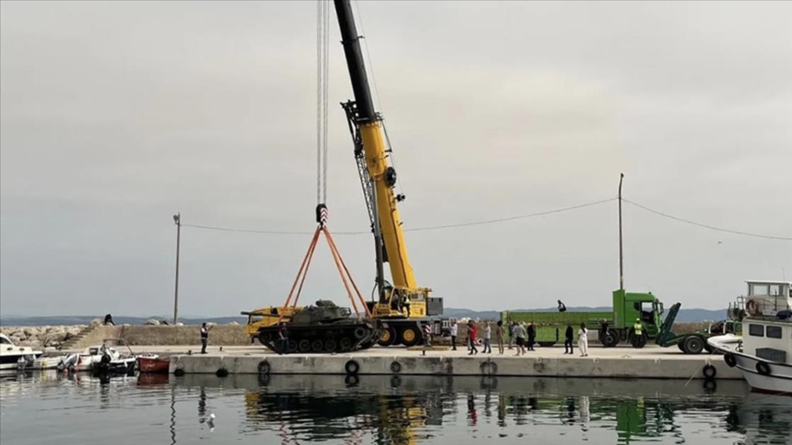Kıyıdan feribotla taşınan tank Gökçetepe sahilinin yaklaşık 100 metre açığında, 10 metre derinliğe vinç yardımıyla indirildi.