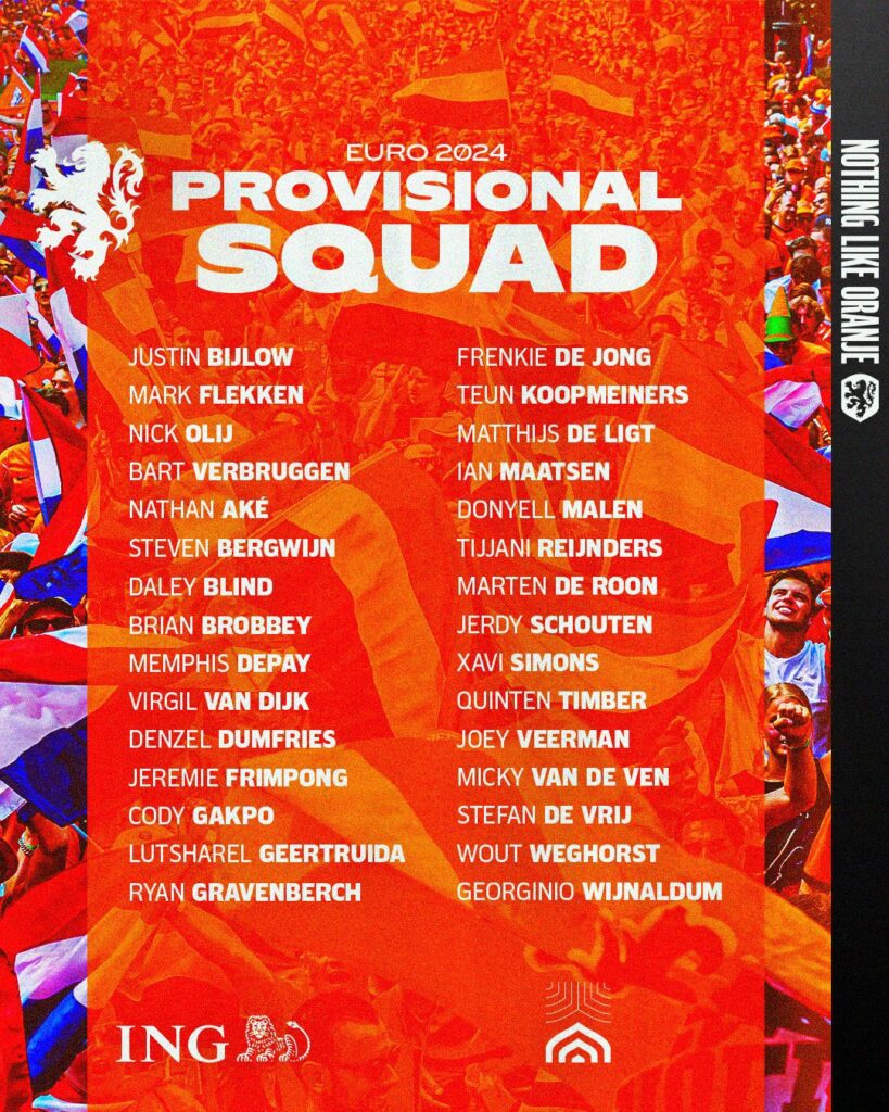 1970’lerde oynadığı futbol ve o dönem futbol maçlarının yeni yeni yayınlanmasıyla beraber kuşaklar boyu taraftar kitlesi olan ekiplerden Hollanda’nın kadrosu da duyurulan bir diğer kadro oldu. 26 kişilik ekipte Jurrien Timber, Joshua Zirkzee ve Wieffer gibi isimlerin yokluğu dikkat çekti.