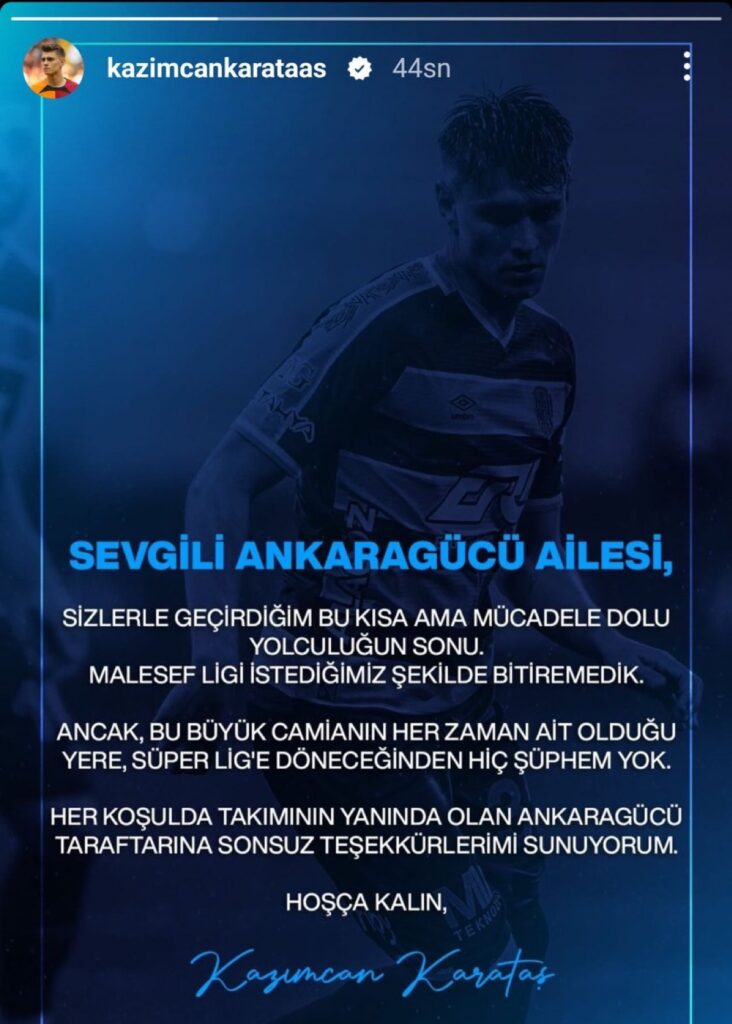 Devre arasında Galatasaray’dan Ankaragücü’ne kiralanan Kazımcan Karataş başkent ekibine veda etti. 21 yaşındaki sol bek, “Sizlerle geçirdiğim bu kısa ama mücadele dolu yolculuğun sonu. Maalesef ligi istediğimiz şekilde bitiremedik ancak bu büyük camianın her zaman ait olduğu yere, Süper Lig’e döneceğinden hiç şüphem yok. Her koşulda takımının yanında olan Ankaragücü taraftarına sonsuz teşekkürlerimi sunuyorum” ifadelerini kullandı. Kazımcan Karataş’ın Galatasaray ile 2027’ye kadar sözleşmesi bulunuyor. Genç sol bek, Ankaragücü ile Süper Lig ve Türkiye Kupası’nda toplam 12 maça çıkıp 622 dakika süre aldı.