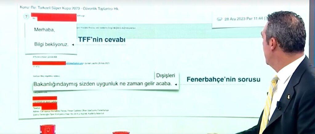 29 Kasım 2023: TFF, Fatih Altaylı’nın yazısını şu açıklamayla yalanladı: “Süper Kupa maçının Suudi Arabistan’da oynanması fikrinin Ali Koç’a ait olduğu iddiasının gerçekle uzaktan yakından ilgisi yoktur.”