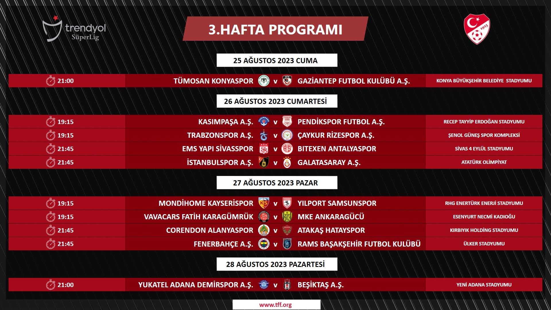 Buna göre 3. haftanın açılış maçı 25 Ağustos Cuma 21.00’de Konyaspor ve Gaziantep FK arasında oynanacak. Galatasaray 26 Ağustos Cumartesi saat 21.45’te İstanbulspor’a konuk olacak. Fenerbahçe ve Başakşehir arasındaki mücadele pazar 21.45’te. Adana Demirspor ve Beşiktaş arasında Adana’da oynanacak maçsa 28 Ağustos Pazartesi 21.00’de.