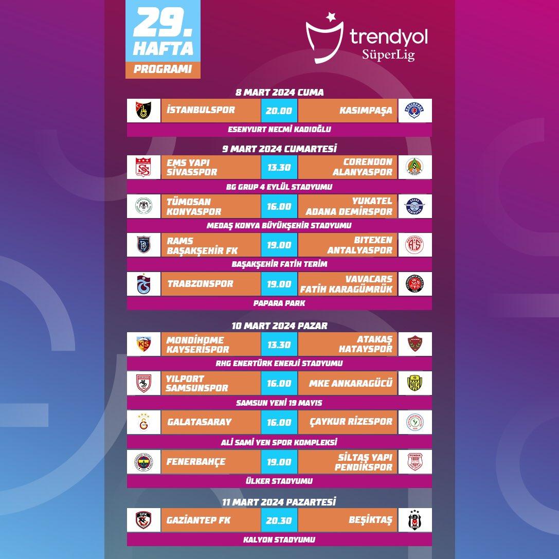 Hem Fenerbahçe hem Galatasaray’ın Avrupa maçlarının oynanacak olmasından sebep TFF, mart ortasına doğru pazar mesaisini sıklaştırdı. 29. haftada Galatasaray Rizespor’u 10 Mart Pazar 16.00’da konuk edecek. Fenerbahçe, Pendikspor’la aynı gün 19.00’da karşılaşacak. Beşiktaş 11 Mart Pazartesi 19.00’da Gaziantep FK deplasmanında haftayı kapatacak. Trabzonspor 9 Mart Cumartesi günü 19.00’da Karagümrük’ü ağırlayacak.