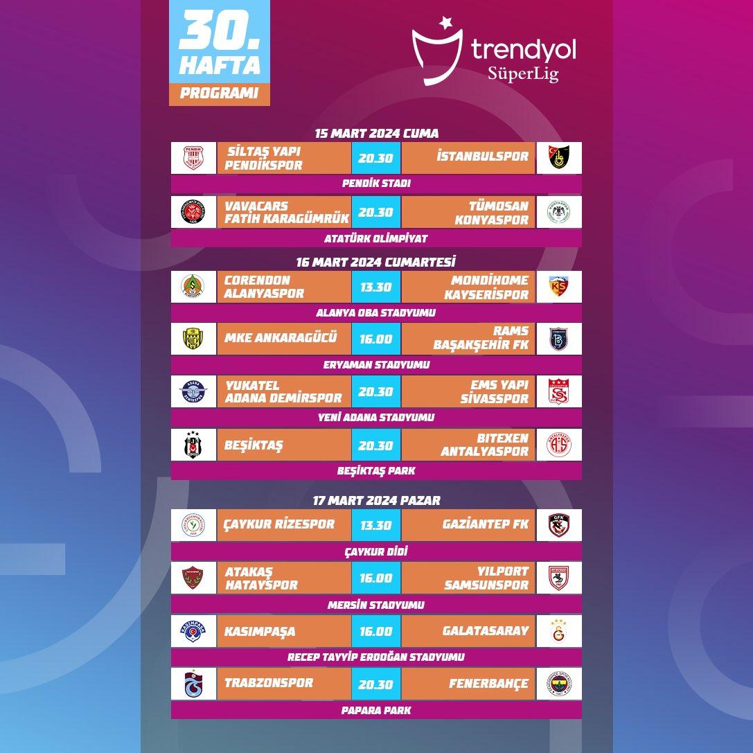 Süper Lig’de 30. hafta programı bu şekilde.