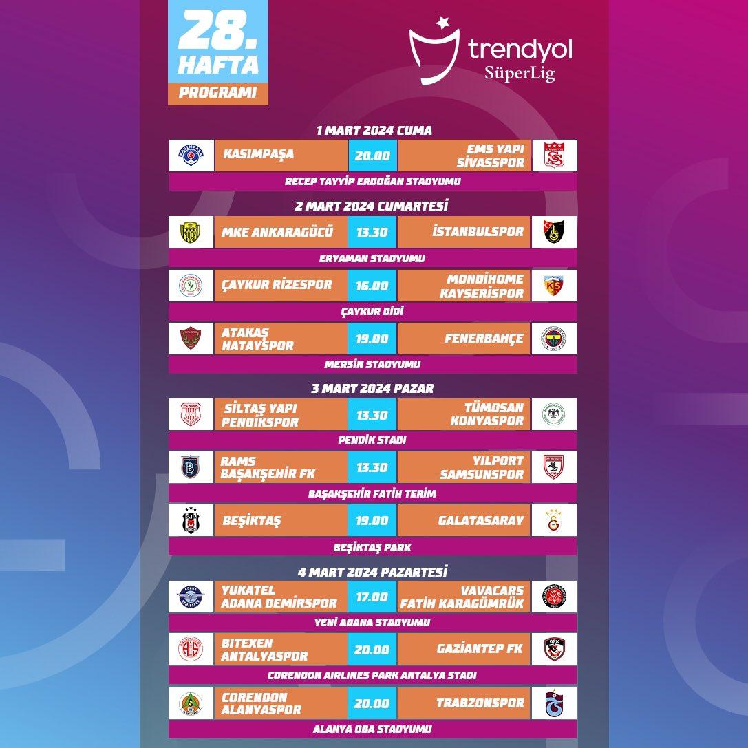 Beşiktaş’ın Galatasaray’ı ağırlayacağı ve ligin kaderi açısından belirleyici olması muhtemel derbi 3 Mart akşamı saat 19.00’da Dolmabahçe’de. 2 Mart Cumartesi akşamı Fenerbahçe, Hatayspor deplasmanında olacak. Üçüncülük mücadelesindeki Trabzonspor haftanın kapanışında 4 Mart Pazartesi 20.00’de Alanyaspor deplasmanına çıkacak.