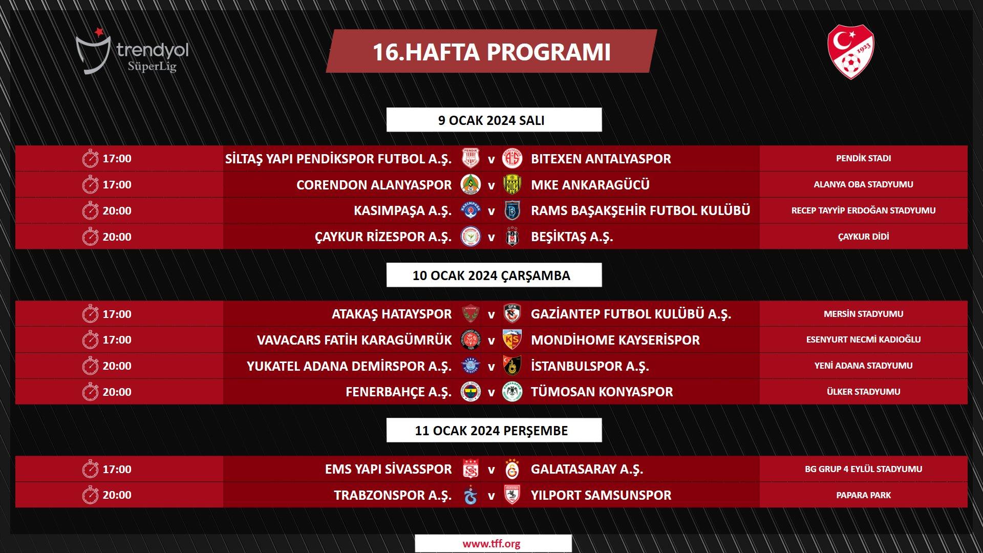 Ertelenen 16. hafta maçları 9 Ocak Salı 17.00’deki Alanyaspor – Ankaragücü maçıyla başlayacak. Aynı gün 20.00’de Rizespor Beşiktaş’la evinde oynayacak. Fenerbahçe 10 Ocak Çarşamba akşamı 20.00’de Konyaspor’la evinde karşılaşacak. Galatasaray 11 Ocak Perşembe 17.00’de Sivasspor’a konuk olacak. Hafta Trabzonspor’un Samsunspor’u ağırladığı Karadeniz derbisiyle kapanacak.