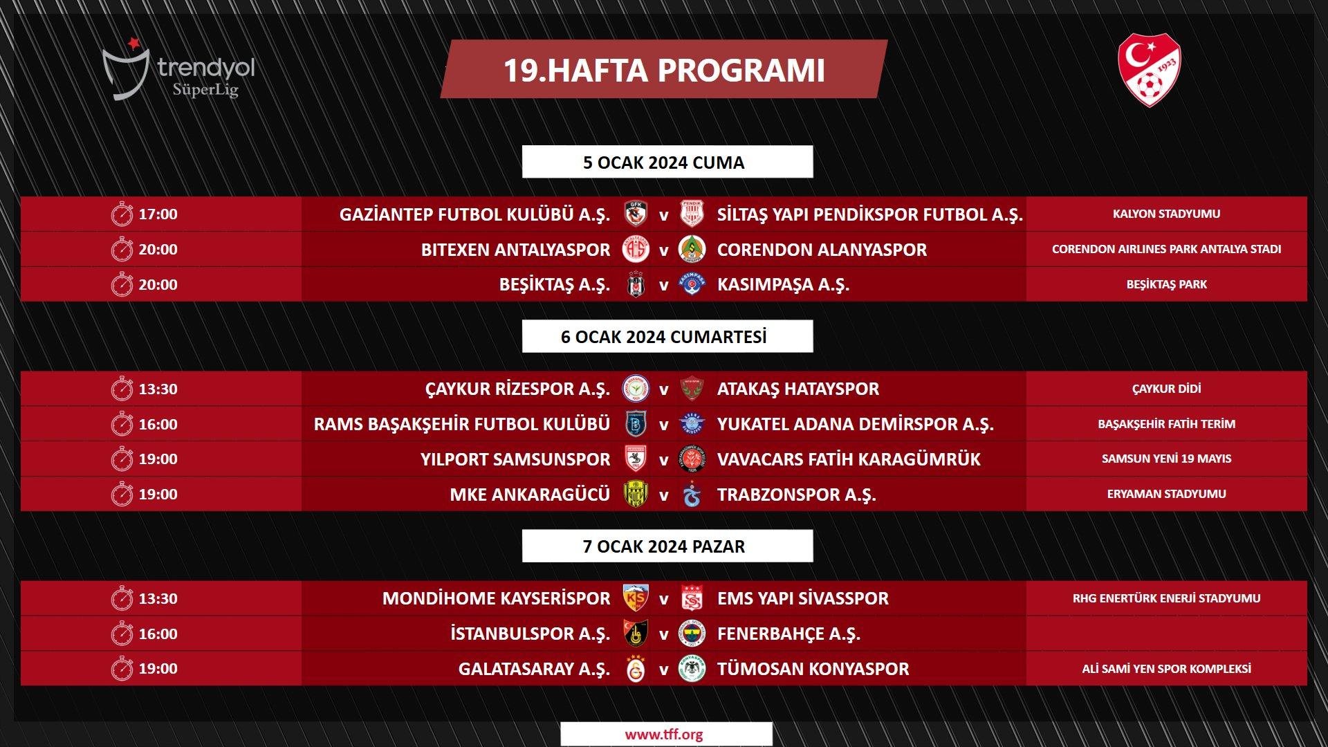 Süper Lig’de 19. hafta programı bu şekilde.