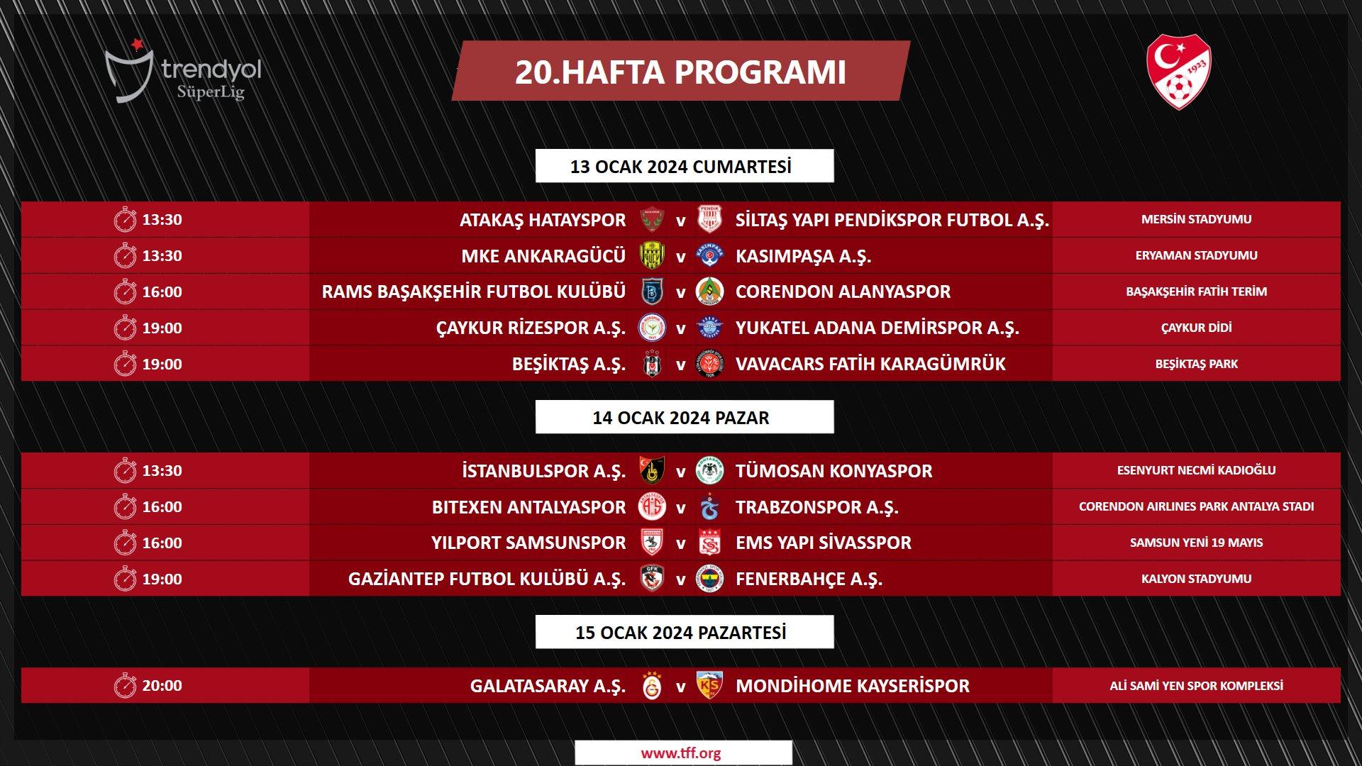 Süper Lig’in 20. hafta müsabakaları 13 Ocak Cumartesi 13.30’da Hatayspor – Pendikspor maçıyla başlıyor. Aynı gün 19.00’da Beşiktaş Karagümrük’ü konuk edecek. Fenerbahçe 14 Ocak Pazar saat 19.00’da Gaziantep deplasmanına çıkacak, Galatasaray hafta kapanışında pazartesi günü 20.00’de Kayserispor’u konuk edecek.