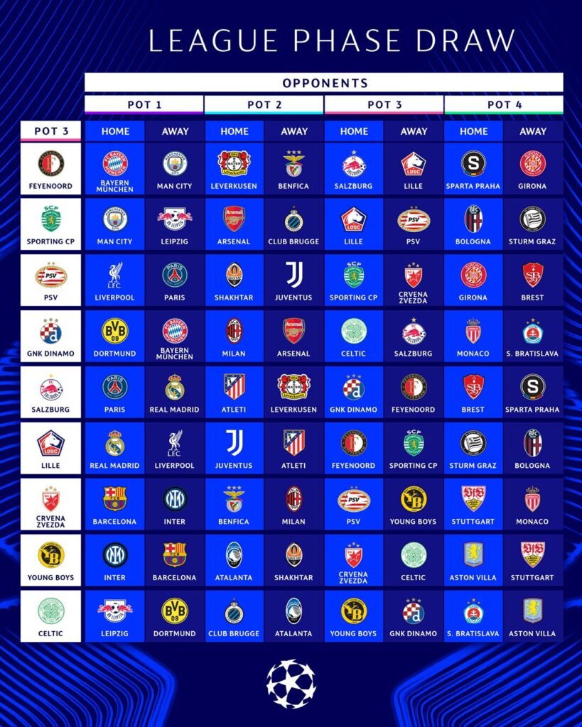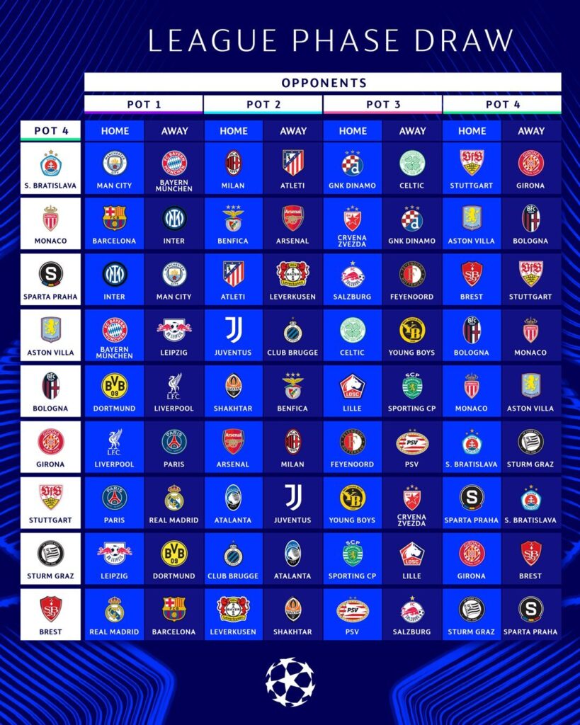 Kura çekimi sonucunda Slovan Bratislava, Monaco, Aston Villa, Sparta Prag, Bologna, Girona, Stuttgart, Sturm Graz, Brest’in olduğu dördüncü pottaki takımların rakipleri ve fikstürü şöyle:
