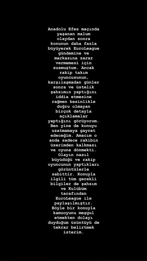 Tarık bu açıklamalara yanıt verdi. Milli basketbolcu “Anadolu Efes maçında yaşanan malum olaydan sonra konunun daha fazla büyüyerek EuroLeague gündemine ve markasına zarar vermemesi için susmuştum. Ancak rakip takım oyuncusunun, karşılaşmadan günler sonra üstelik şahsımın yaptığını iddia etmesine rağmen kesinlikle doğru olmayan birçok detayla açıklamalar yaptığını görüyorum. Ben yine de konuyu uzatmamaya gayret edeceğim. Amacım o anda sadece rakibin üzerimden kalkması ve oyuna dönmekti. Olayın nasıl büyüdüğü ve rakip oyuncunun yaptıkları görüntülerle sabittir. Konuyla ilgili tüm gerekli bilgiler de şahsım ve Kulübüm tarafından EuroLeague ile paylaşılmıştır. Böyle bir konuyla kamuoyunu meşgul etmekten dolayı duyduğum üzüntüyü tekrar belirtmek isterim” dedi.