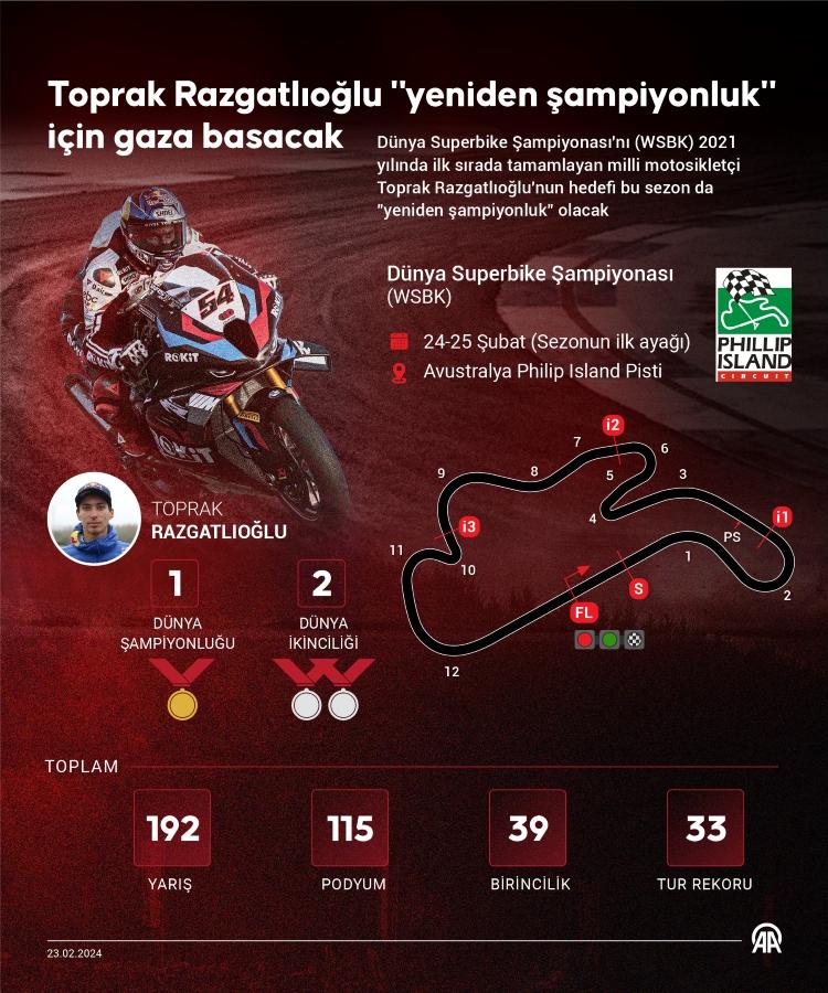 Toprak Razgatlıoğlu, yeni takımı BMW ile ilk yarışına çıktı. WorldSBK’de 2021 yılının şampiyonu milli motosikletçi Toprak Razgatlıoğlu, 2022 ve 2023 yıllarında Dünya Superbike Şampiyonası’nda ikinciliği kazandı. Mili sporcu, yarışlarda 115 podyum gördü, 39 yarış kazanırken 33 tur rekoru kırdı.