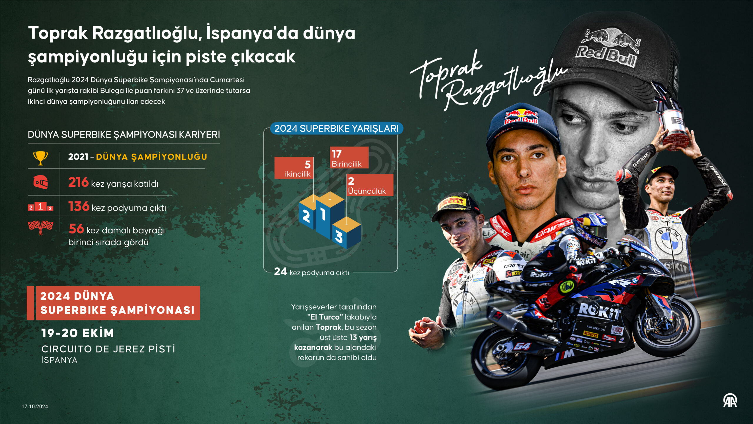 Genel klasmanda 473 puanla en yakın rakibi Aruba Ducati takımından Nicolo Bulega’ın 46 puan önünde yer alan Toprak, Jerez’de 19 Ekim Cumartesi günü yapılacak ilk yarış sonunda şampiyonluğunu ilan edebilir. Toprak ilk yarış sonunda Bulega ile puan farkını 37 ve üzerinde tutması halinde 20 Ekim Pazar günkü yarışlara bakılmaksızın 2024 dünya şampiyonluğunu garantileyecek.
