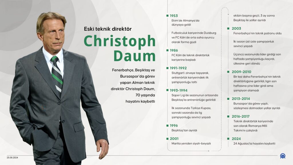 Christoph Daum yaşamını yitirdi. Türk futbolu 24 Ağustos’u 25 Ağustos’a bağlayan gece acı bir haber aldı. Teknik direktörlük kariyerinde Fenerbahçe, Beşiktaş ve Bursaspor’u da çalıştıran Alman teknik direktör Christoph Daum 70 yaşında yaşamını yitirdi. Daum bir süredir kanserle boğuşuyordu. Alman teknik direktör bu savaşı kaybetti. Arkasında onu seven binlerce futbolsever ve Türk futboluna onlarca anı bıraktı. Ölüm haberini Alman futbol insanının ailesi duyurdu. Birçok Türk futbolsever sosyal medyadan 2000’lerin ortasına damga vuran takımı yaratan Alman hocaya veda paylaşımları yaptılar.