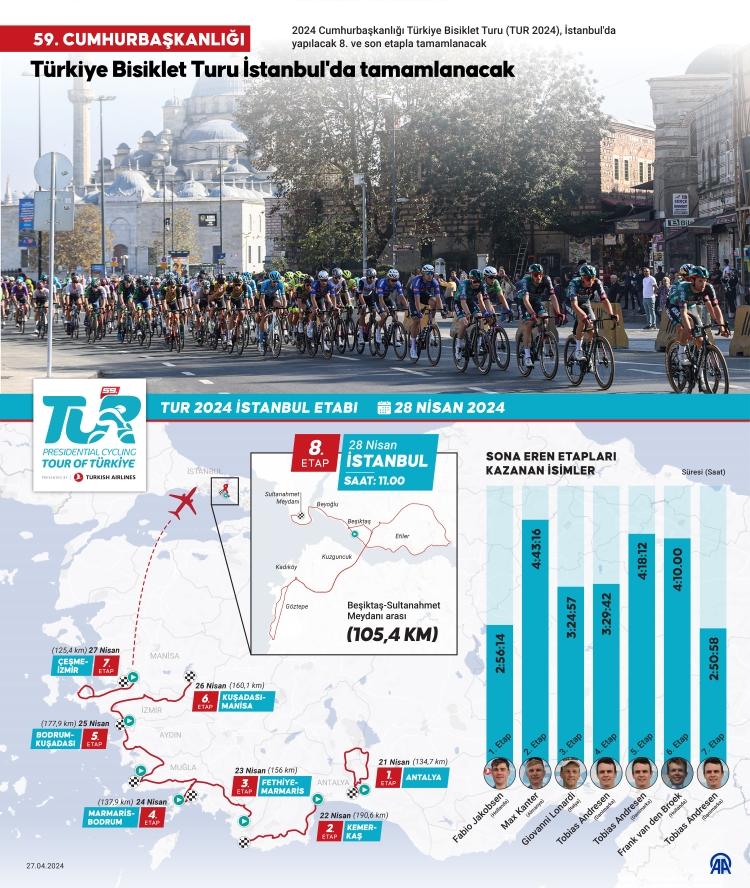 Akdeniz ve Ege sahillerini geride bırakan bisikletçiler, organizasyonun 8. ve son etabının yapılacağı İstanbul’a hava yoluyla geçecek. Startıpazar günü saat 11.00’de Beşiktaş Meydanı’nda verilecek TUR 2024’ün 105,4 kilometrelik en kısa etabı, Sultanahmet Meydanı’nda sona erecek.