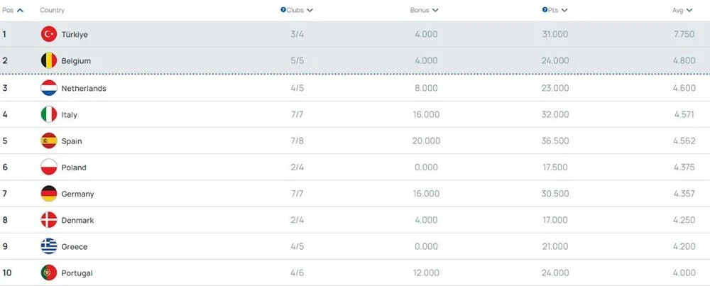 UEFA ülke puanı sıralamasında ilk 10 ülke ve onların kupalara devam eden takımları şöyle…